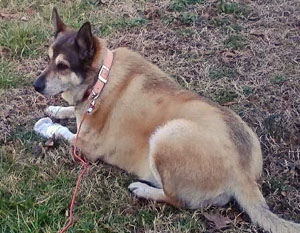 This is Biscuit… you can see her left paw is wrapped after surgery to remove/amputate a toe. There was a merca infection that would not heal. Good news is that this 10-year-old girl is healing and doing well! The owner is disabled and Biscuit actually is her service dog and is very happy to have her back.