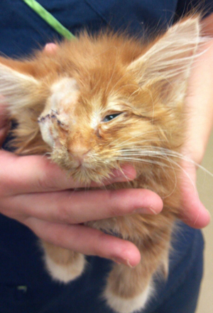 Doodles was found at 8 weeks old under some leaves with his eye out of socket by a 3-year-old girl.  The family adopted him immediately, but needed help with the surgical costs for the eye enucleation  (removal).  Surgery had risk with his young age.  He came out of surgery okay, but was in critical condition the following day with hypothermia.  Warm heating pads, constant care by vet staff, and hand feeding raised his temperature to 98 degrees so he could go home for further care.  Hopefully, with the love of his “little mommy,” he will heal quickly.
