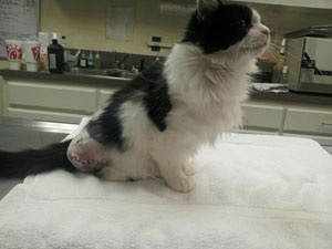 This is Jake. He is a 2-year-old, part Persian cat. The owner let him out of the porch for a bit and he was attacked by a dog. Jake had a broken femur and hip and was about to undergo surgery to fix, but an overnight stay confirmed he really did not have feeling in his toes. Nerve damage required a leg amputation. Both Jake and 82 year old owner are happy to be reunited as euthanization was avoided with The Sergei Foundation’s help!